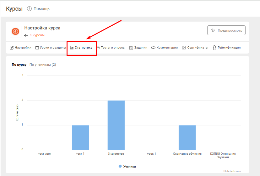Раздел Статистики позволяет видеть динамику прохождения курса учениками.